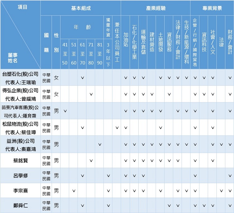 本公司於所訂定「公司治理實務守則」及「董事選任程序」列示有董事會成員組成多元化方針,董事會成員應注重性別平等,並普遍具備執行職務所必須之知識、技能及素養,包含1.營運判斷能力、2.會計及財務分析能力、3.經營管理能力、4.危機處理能力、5.產業知識、6.國際市場觀、7.領導能力及8.決策能力。本公司為踐行董事會成員多元化政策,現階段設定至少2名女性董事席次,另為強化公司治理,於110年12月29日董事會通過修訂「公司治理實務守則」,增加女性董事比率宜達董事席次三分之一。本屆董事9人,多具有相關產業經驗與管理專業背景;1名董事成員兼具本公司經理人身份,佔全體成員比例約11%;2名女性董事成員,佔全體成員比例約22%;2名董事年齡在60歲以下、4名董事年齡在61~70歲、3名董事年齡在71歲以上,董事成員平均年齡為65.2歲;獨立董事年資均在3年以內;4名董事具備新能源發展的產業經驗,將可為公司在能源轉型的發展上,提供更廣泛深遠的建議;另因產業性質以男性從業者居多,為企業永續發展,未來將自產業外管理面尋求女性專業人才,以達成董事會成員多元化目標,擁有平衡性別組成帶來的創造力與創新,期許以上成員多元化特質能為董事會帶來文化與思維變革多元能量。